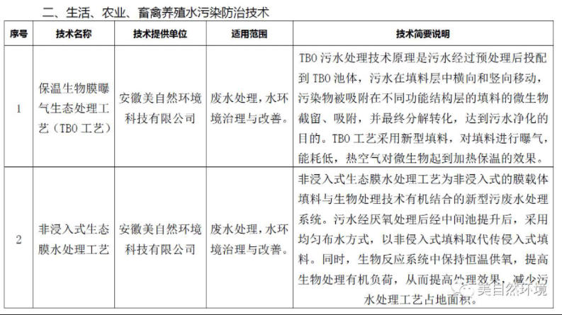 安徽美自然环境科技有限公司申报的两项污水处理技术---保温生物膜曝气生态处理工艺(TBO工艺)和非浸入式生态膜水处理工艺被收录在“生活、农业、畜禽养殖水污染防治技术”类别里。这充分说明了美自然在污水处理行业市场领域里,技术研发取得的创新成果,得到了政府的认可、行业及社会的认同。公司将坚持科技创新,加大科技投入,引领企业发展,为我国环保事业做出更大贡献!