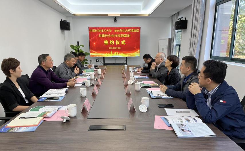 2022年10月13日上午,中国科学技术大学与美自然生态环境集团校企合作实践教学基地签约暨挂牌仪式在美自然集团合肥公司隆重举行。中科大环境科学与工程系执行主任俞汉青、党总支书记张文真、副主任穆杨、副主任花正双、教授刘贤伟、教学秘书乔珍以及美自然集团董事长周其胤、董秘李兰胜、副总经理赵军等相关负责人出席签约仪式。