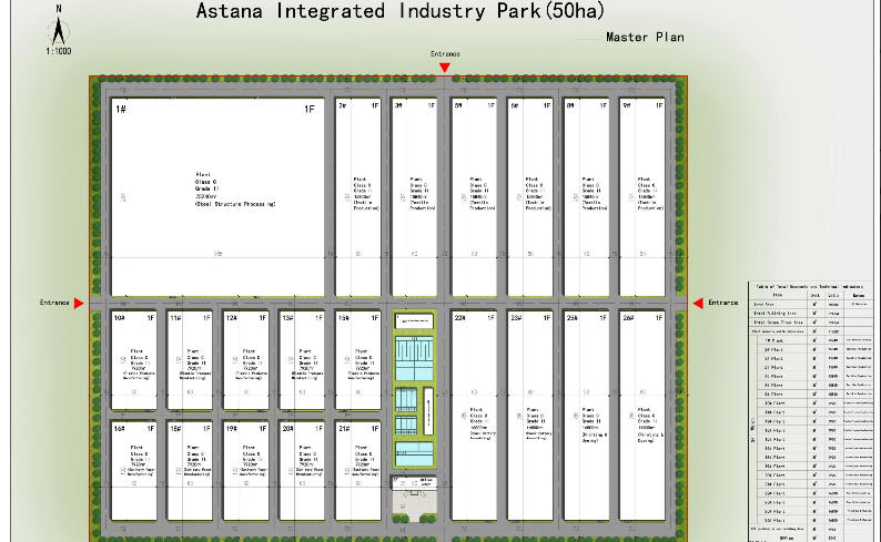 基于哈国社会经济发展实际情况,拟于首都阿斯塔纳开展综合工业园建设项目,项目总占地约750亩,总建筑面积约32万平米。业态包括钢结构加工、塑料制品生产、卫生用纸生产、纺织、印染和动力电池装配等,并配套建设废水、废气处理设施。